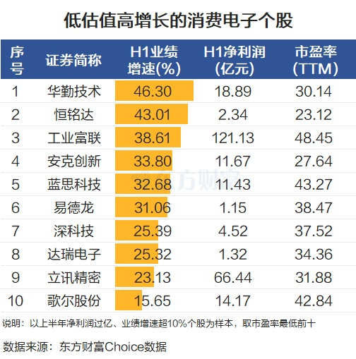 若是以上半年归母净利润过亿个股为样本,取其中业绩增速超10%且市盈率(TTM)最低的10只个股,即下图的低估值高增长的消费电子个股,其中恒铭达、安克创新最新估值低于30倍。