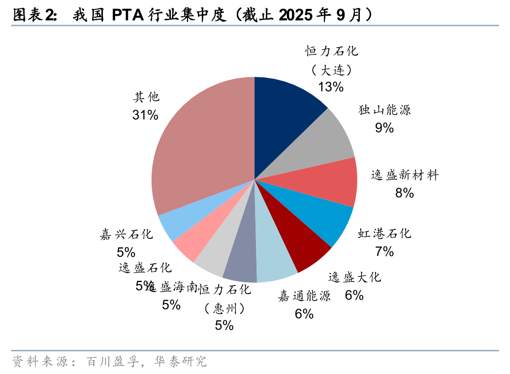 PTA作为聚酯纤维、聚酯瓶片和聚酯薄膜的核心原料,2010年以来行业经历了两轮扩产周期,截至25年9月,我国PTA有效产能规模增长至9135万吨,供给端快速趋于饱和导致近5年产品价差持续低位徘徊。据百川盈孚,我国PTA产能基本集中在5家头部企业之中,主要包括:恒力石化大连及惠州合计1660万吨、桐昆股份1020万吨、新凤鸣800万吨、逸盛(两大股东分别为恒逸石化、荣盛石化)合计2200万吨、连云港某厂650万吨,行业集中度CR5近70%,未来两年基本无新增产能投放计划。