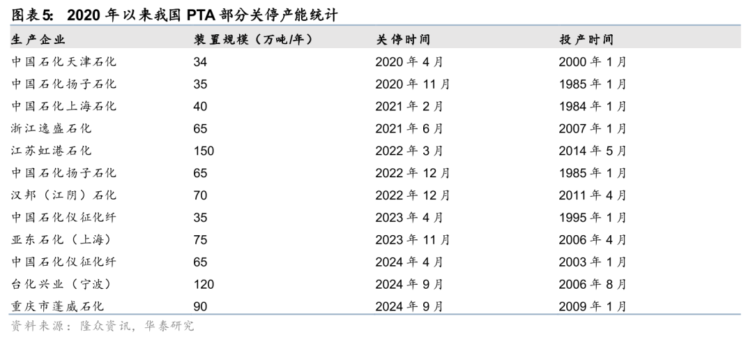 据各公司环评报告,2019年以来的本轮扩产周期新建装置基本采用BP、INVISTA等研发的新一代技术,装置规模均在250万吨及以上,同时新技术在能耗、物耗和环保方面均有较前一代装置大幅下降,但也导致了行业继续五年低迷。与此同时,新装置的成本优势正逐步倒逼高成本老旧装置出清,据隆众资讯,2020年以来产能规模150万吨以下的老旧装置已陆续关停,目前国内PTA行业名义开工率在75%左右,新技术产能基本满产,行业供给格局有望优化。