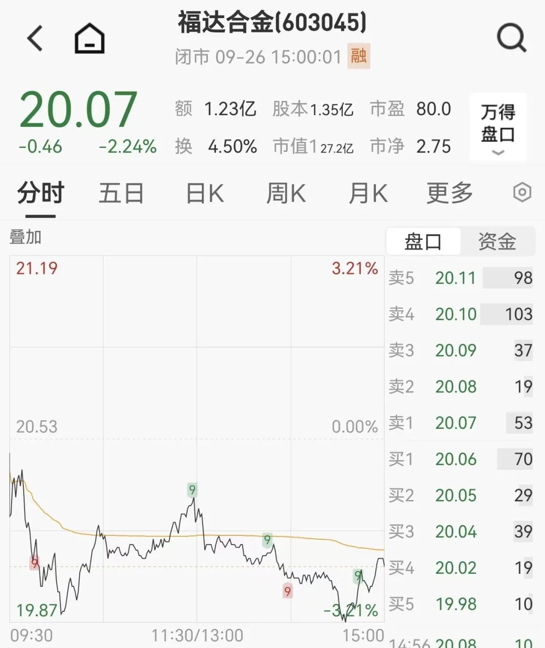 截至9月26日收盘,福达合金股价报20.07元/股,总市值超27亿元。