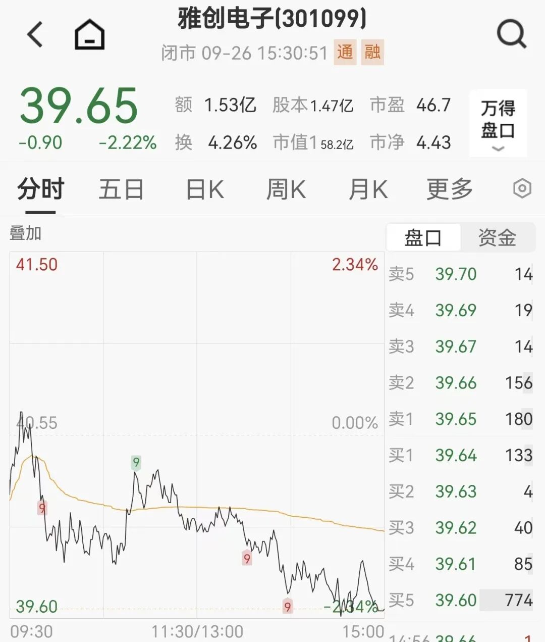 截至9月26日收盘,雅创电子收报39.65元/股,总市值58.15亿元。