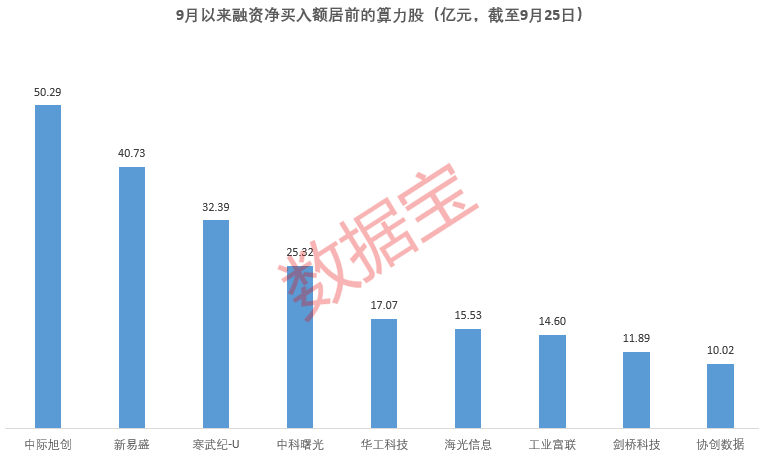 证券时报·数据宝梳理了9月(截至9月25日)融资净买入额居前的算力股,供读者参考。其中,融资净买入额超过10亿元的个股有9只,中际旭创、新易盛、寒武纪-U、中科曙光排名前四,对应金额依次为50.29亿元、40.73亿元、32.39亿元、25.32亿元。