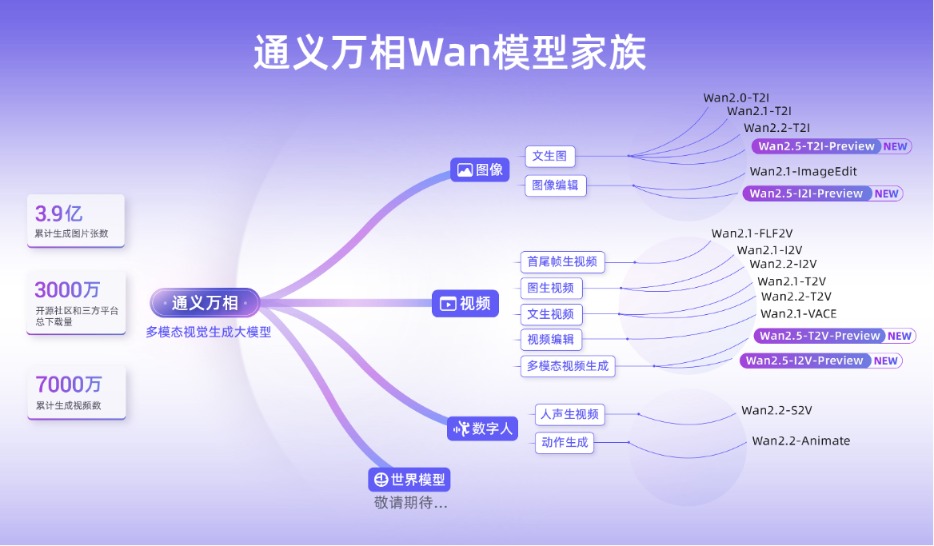 通义万相是通义大模型家族中的视觉基础模型,此次推出的Wan2.5-preview系列模型,涵盖文生视频、图生视频、文生图和图像编辑四大模型。