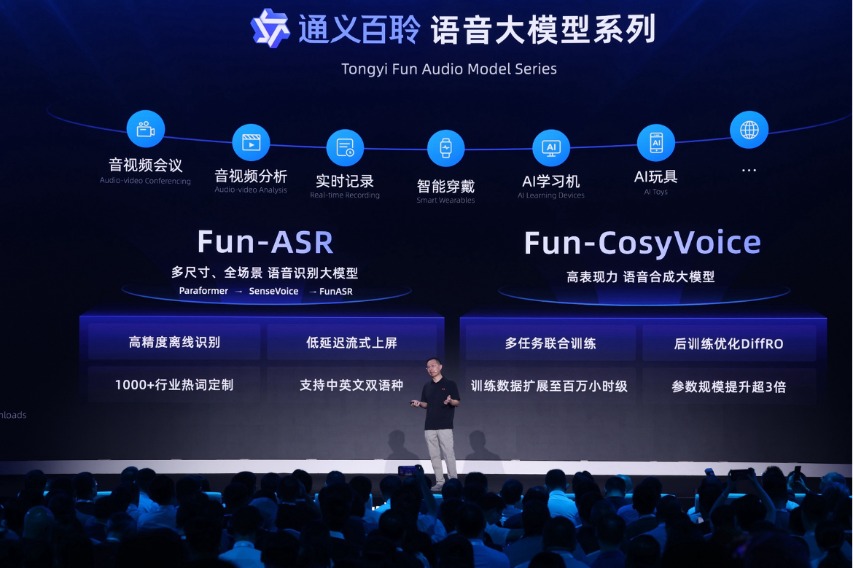 此次云栖大会上,通义大模型家族迎来了新成员——语音大模型通义百聆。百聆新发布了语音识别大模型Fun-ASR和语音合成大模型Fun-CosyVoice。Fun-ASR基于数千万小时真实语音数据训练而成,具备上下文理解能力与行业适应性;Fun-CosyVoice可提供上百种预制音色,可以用于客服、销售、直播电商、消费电子、有声书、儿童娱乐等场景。