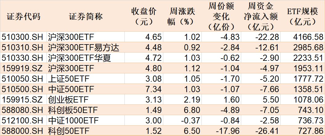 具体ETF方面,规模较大的10只宽基指数ETF本周合计净流出86.17亿元,其中科创50ETF净流出26.41亿元。