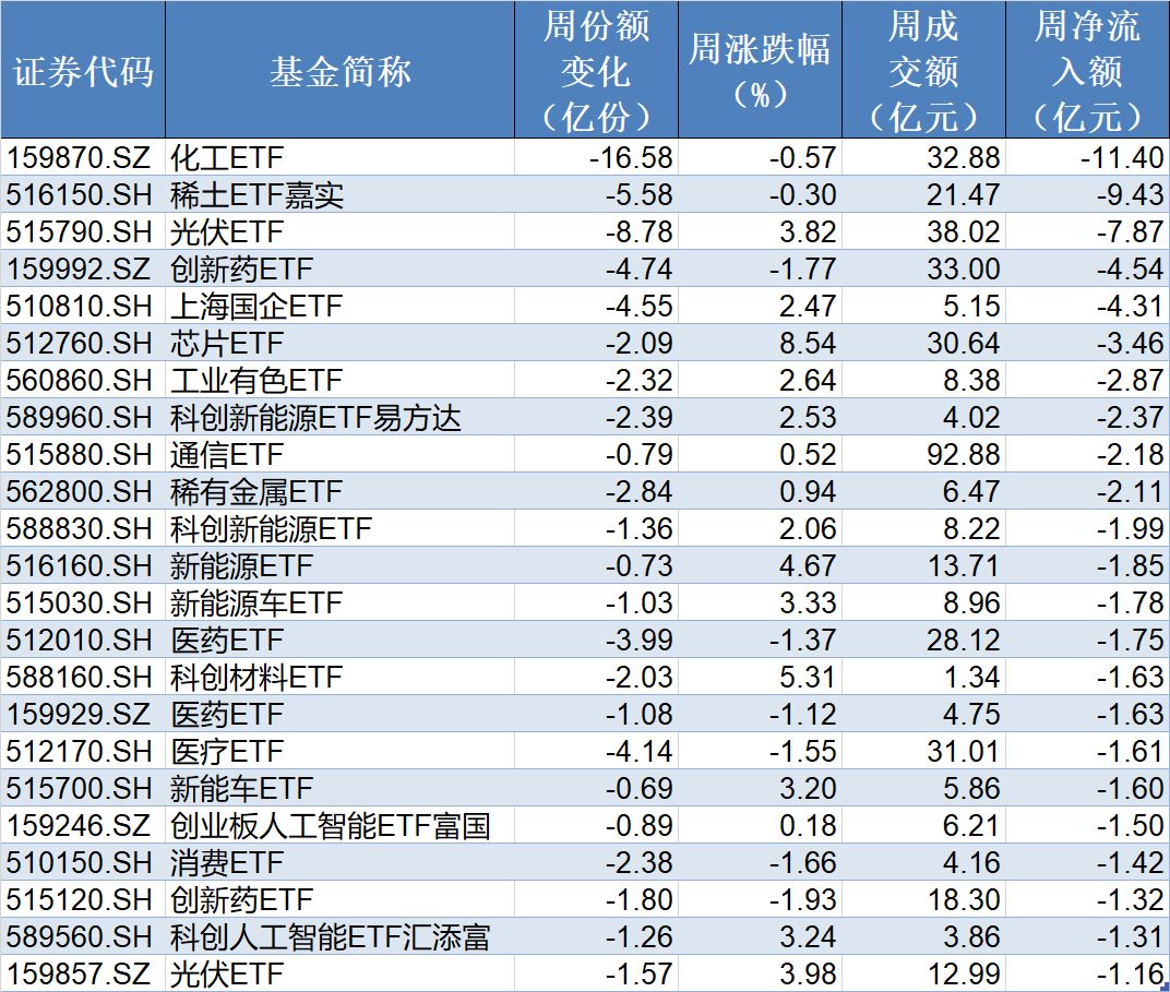 行业主题上看,科创芯片ETF等被资金看好,而化工、稀土相关ETF被资金抛售。