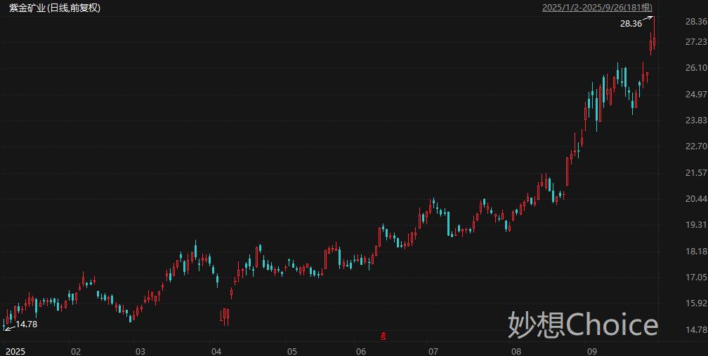 金、铜矿储量及产量均为全国第一的紫金矿业周五盘中一度大涨4%,触及28.36元/股,刷新历史新高,最新总市值超7282亿元。华安证券分析师黄玺等人8月31日研报指出,铜金银量价齐增,矿山收入延续增长。25H1紫金矿业矿山产铜收入272.61亿元(同比+12.73%),矿山产金收入264.55亿元(同比+62.15%)。产量方面,公司实现矿产铜57万吨(同比+9%),矿产金41吨(同比+16%)。价格方面,25H1国内铜均价7.76万元/吨(同比+3.9%),黄金均价722元/克(同比+38.6%)。