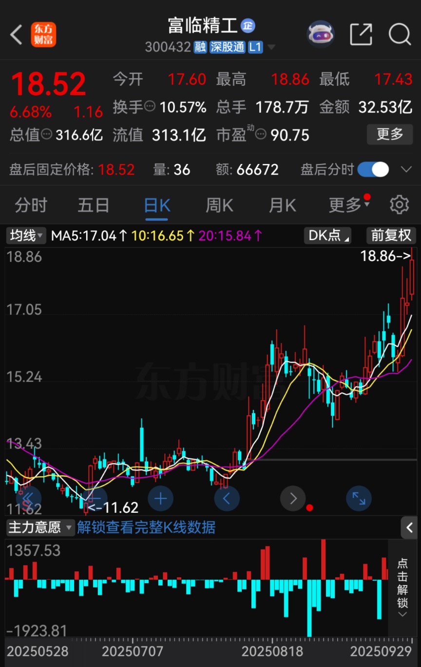 截至9月29日收盘,富临精工股价报18.52元/股,涨幅达6.68%,总市值为316.6亿元。