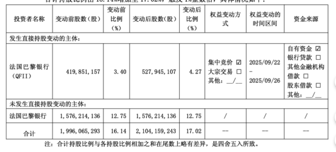 9月28日,南京银行发布公告称,法国巴黎银行(QFII)于2025年9月22日至2025年9月26日期间,以自有资金通过上海证券交易所交易系统以集中竞价交易方式增持本公司股份108,093,950股,占本公司总股本的0.87%。法国巴黎银行及法国巴黎银行(QFII)合计持股比例由16.14%增加至17.02%。