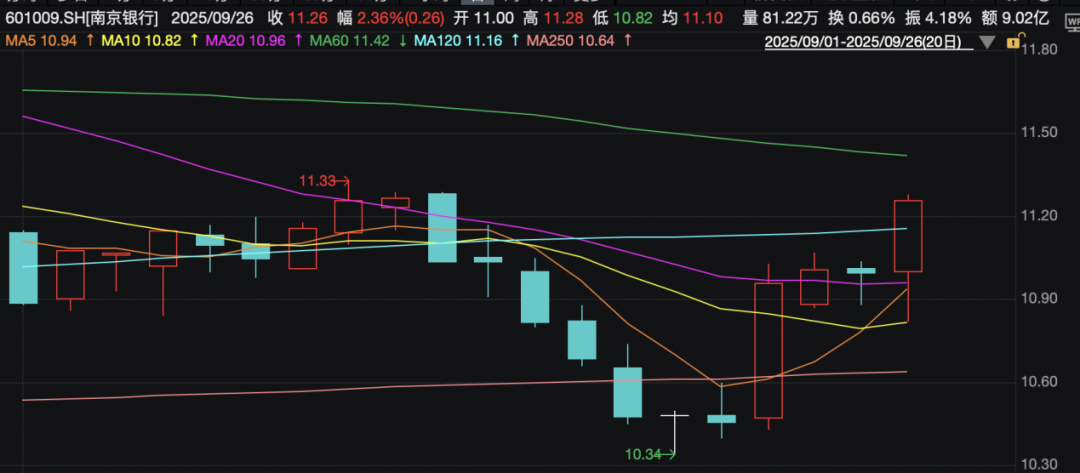 本月,银行股经历回调后反弹。9月22日,南京银行股价回调至10.46元/股。截至9月26日,南京银行报收于11.26元/股。