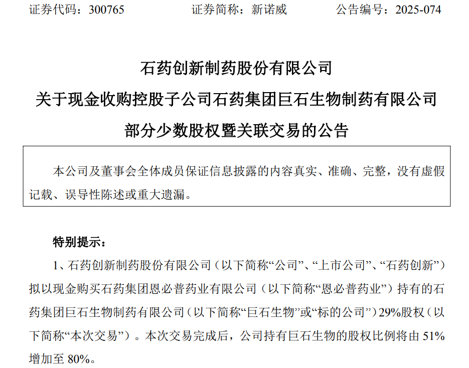 新诺威(300675)9月30日公告,公司拟以现金购买石药集团恩必普药业有限公司(简称“恩必普药业”)持有的石药集团巨石生物制药有限公司(简称“巨石生物”)29%股权。本次交易完成后,公司持有巨石生物的股权比例将由51%增加至80%。本次交易标的股权的转让价款为11亿元。