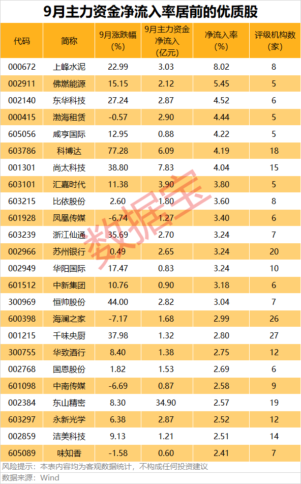一批机构关注度较高且主力资金净流入率较高的个股值得关注。数据显示,5家及以上机构评级个股中,上峰水泥主力资金净流入率居首,超过8%,该股9月累计涨幅接近23%。