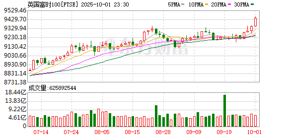 欧股市场:欧洲三大股指09月29日全线上涨。英国伦敦股市《金融时报》100种股票平均价格指数报收于9299.84点,较前一交易日上涨15.01点,涨幅为0.16%;法国巴黎股市CAC40指数报收于7880.87点,较前一交易日上涨10.19点,涨幅为0.13%;德国法兰克福股市DAX指数报收于23745.06点,较前一交易日上涨5.59点,涨幅为0.02%。