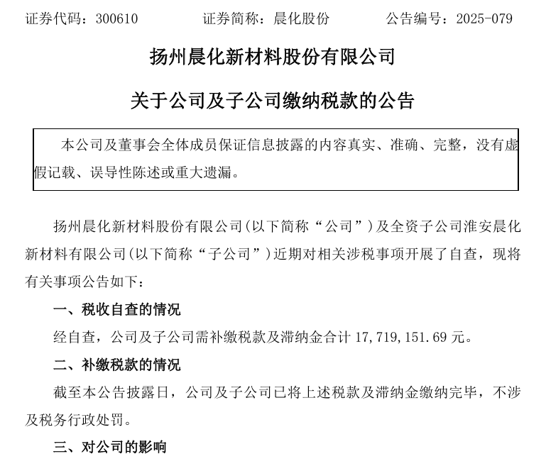 9月30日,晨化股份(300610)发布公告,公司及全资子公司淮安晨化新材料有限公司近期对相关涉税事项开展了自查,发现需补缴税款及滞纳金合计1772万元。