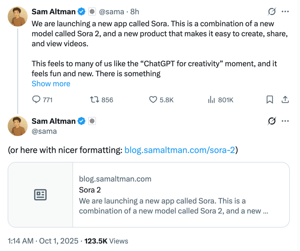 山姆·奥特曼在社交平台X发文介绍Sora 2