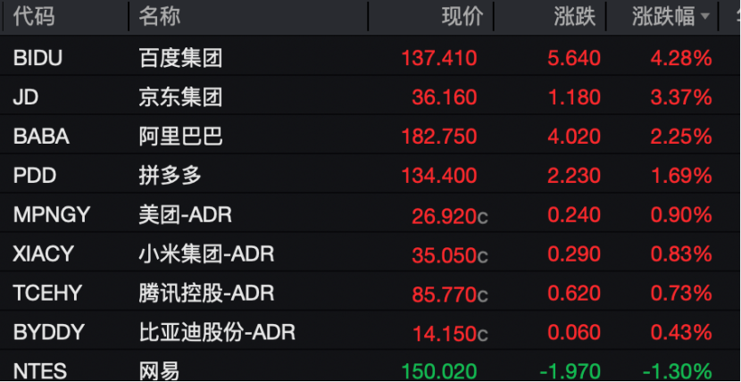 中概股当天同样表现强势,纳斯达克中国金龙指数收涨1.44%。中概科技龙头股中,百度集团涨超4%,京东集团涨超3%,阿里巴巴涨超2%,拼多多涨超1%。