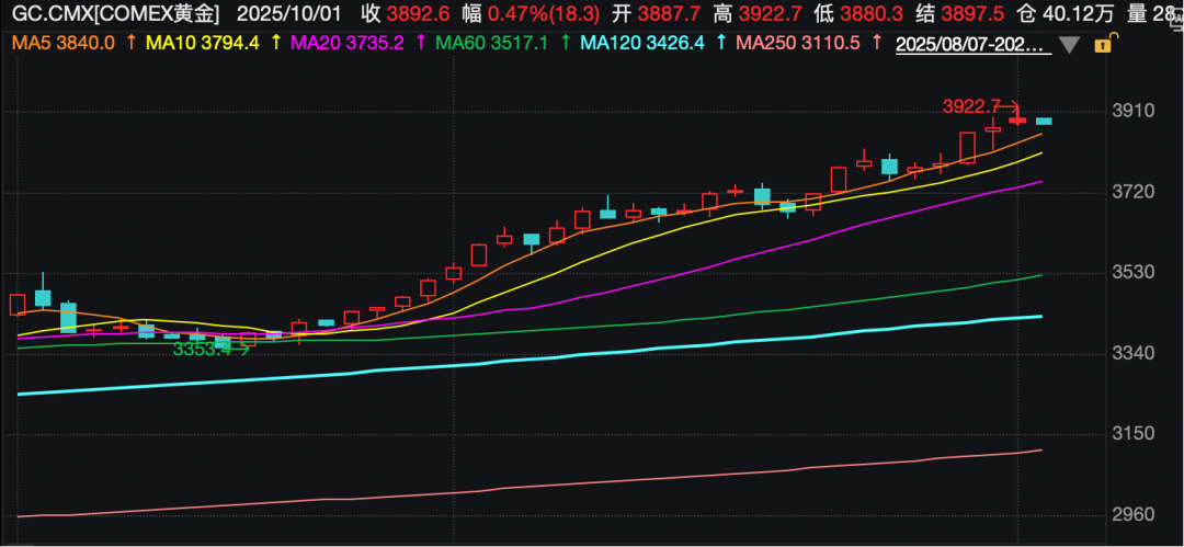 当地时间10月1日(周三),国际金价继续上涨,COMEX黄金期货主力合约盘中突破3900美元/盎司,再创历史新高。伦敦金现价格也继续上行,盘中亦再创历史新高。