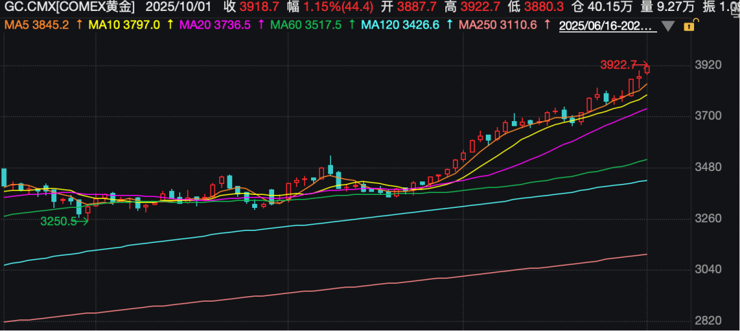 10月1日,国际金价再度走高,伦敦金现盘中最高突破3895美元/盎司,再刷新历史纪录,距离3900美元/盎司关口仅一步之遥。COMEX黄金则突破3900美元/盎司,亦刷新历史纪录。
