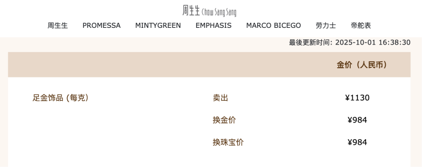 10月1日,记者在黄金珠宝品牌周生生官网看到,其当日足金饰品报价已达到1130元/克,周大福的报价也达到1129元/克。