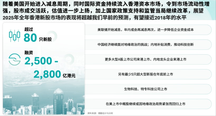 德勤中国资本市场服务部预计,香港新股市场2025年全年将有80只新股上市,融资2500亿港元至2800亿港元,较其6月中旬预测的全年新股上市融资规模(2000亿港元)明显增长;从新股类型看,除“A+H”双重上市的新股外,医药公司、特专科技公司及消费公司上市也将成为市场的亮点。