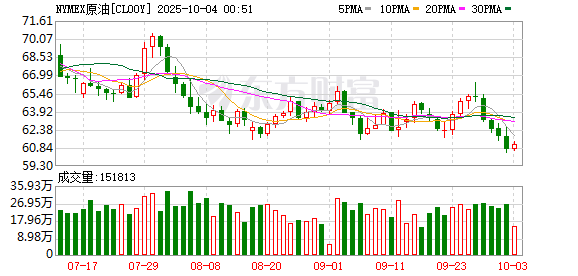 商品市场:国际油价10月01日下跌。截至当天收盘,纽约商品交易所WTI原油期货当月连续合约结算价下跌0.59美元,收于每桶61.78美元,跌幅为0.95%;伦敦布伦特原油期货当月连续合约下跌0.68美元,收于每桶65.35美元,跌幅为1.03%。COMEX黄金期货当月连续合约上涨24.30美元,涨幅0.63%,报3897.5美元/盎司,续创历史新高。
