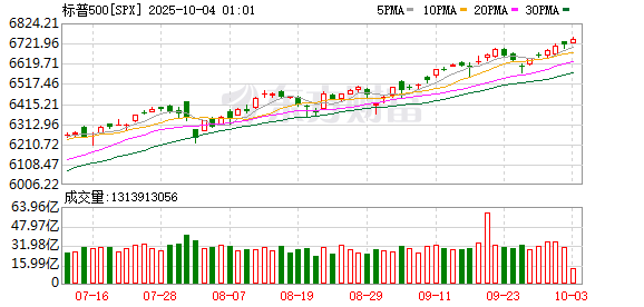 美股市场:美股三大指数10月01日收盘全线上涨。截止收盘,道琼斯工业平均指数比前一交易日上涨43.21点,收于46441.1点,涨幅为0.09%,创收盘新高;标准普尔500种股票指数上涨22.74点,收于6711.2点,涨幅为0.34%,创收盘新高;纳斯达克综合指数上涨95.15点,收于22755.16点,涨幅为0.42%。