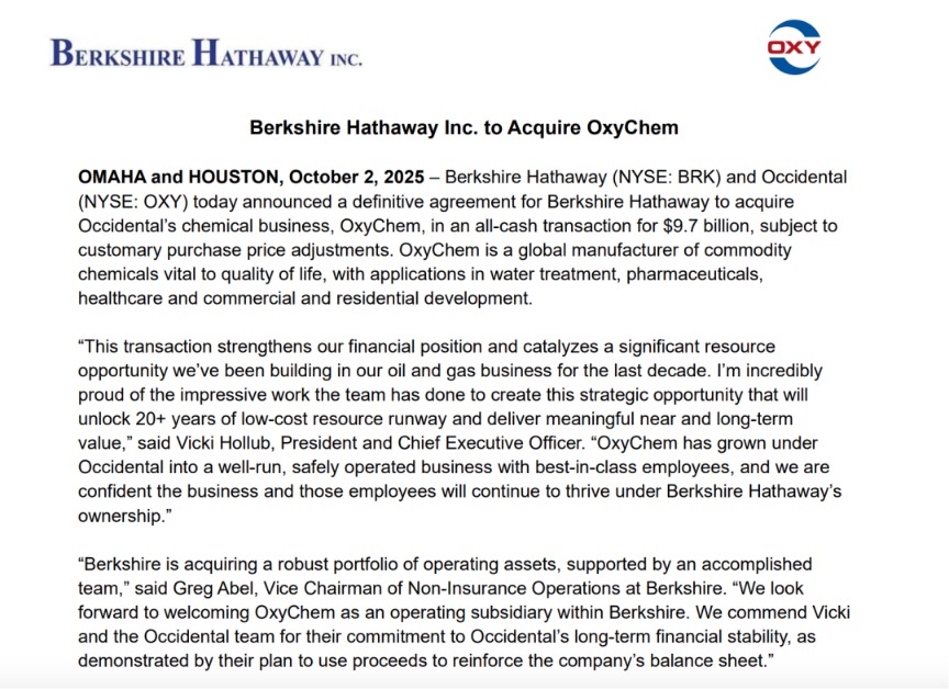 消息面上,10月2日美股盘前,西方石油以及巴菲特旗下伯克希尔·哈撒韦公司共同发布声明,宣布伯克希尔将以全现金交易方式收购西方石油旗下化工业务子公司OxyChem,交易金额为97亿美元。
