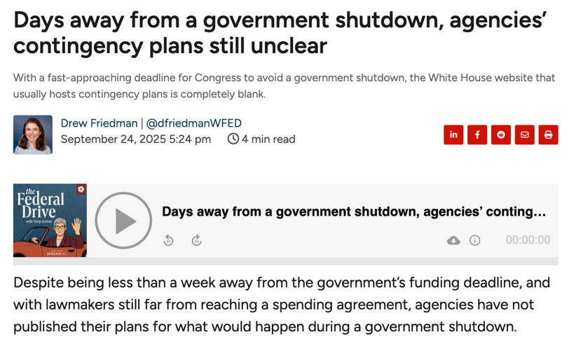 专门聚焦报道联邦政府管理与政策的美国媒体Federal News Network报道,尽管政府面临“停摆”,但两党在主要问题上的分歧远未达成一致。