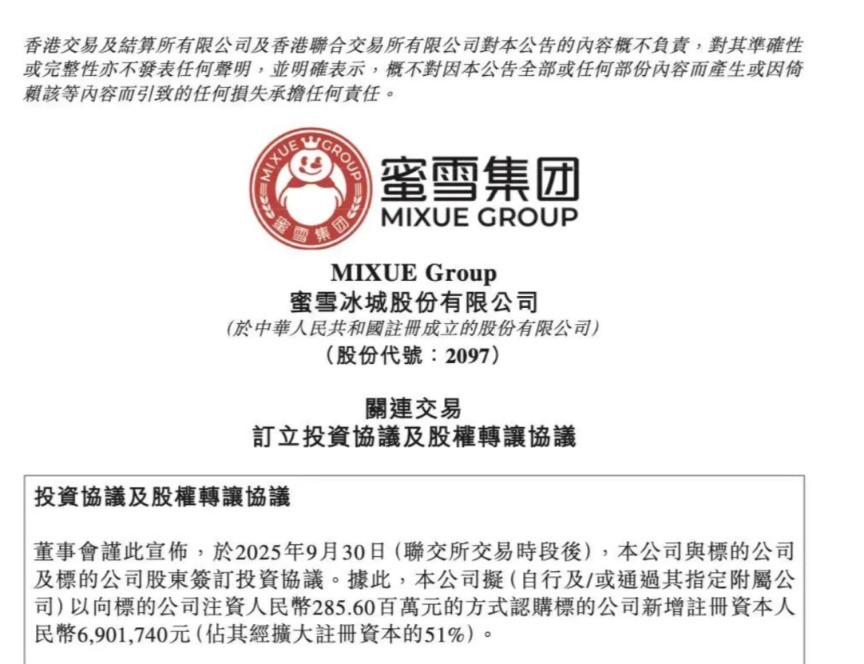 10月1日,蜜雪集团发布公告称,9月30日联交所交易时段后,蜜雪集团已与标的公司及标的公司股东签订投资协议,此次标的公司为福鹿家(郑州)企业管理有限公司(以下简称“福鹿家”)。