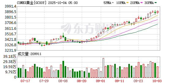 商品市场:国际油价10月03日上涨。截至当天收盘,纽约商品交易所WTI原油期货当月连续合约结算价上涨0.40美元,收于每桶60.88美元,涨幅为0.66%;伦敦布伦特原油期货当月连续合约上涨0.42美元,收于每桶64.53美元,涨幅为0.66%。COMEX黄金期货当月连续合约上涨40.80美元,涨幅1.05%,报3908.9美元/盎司。