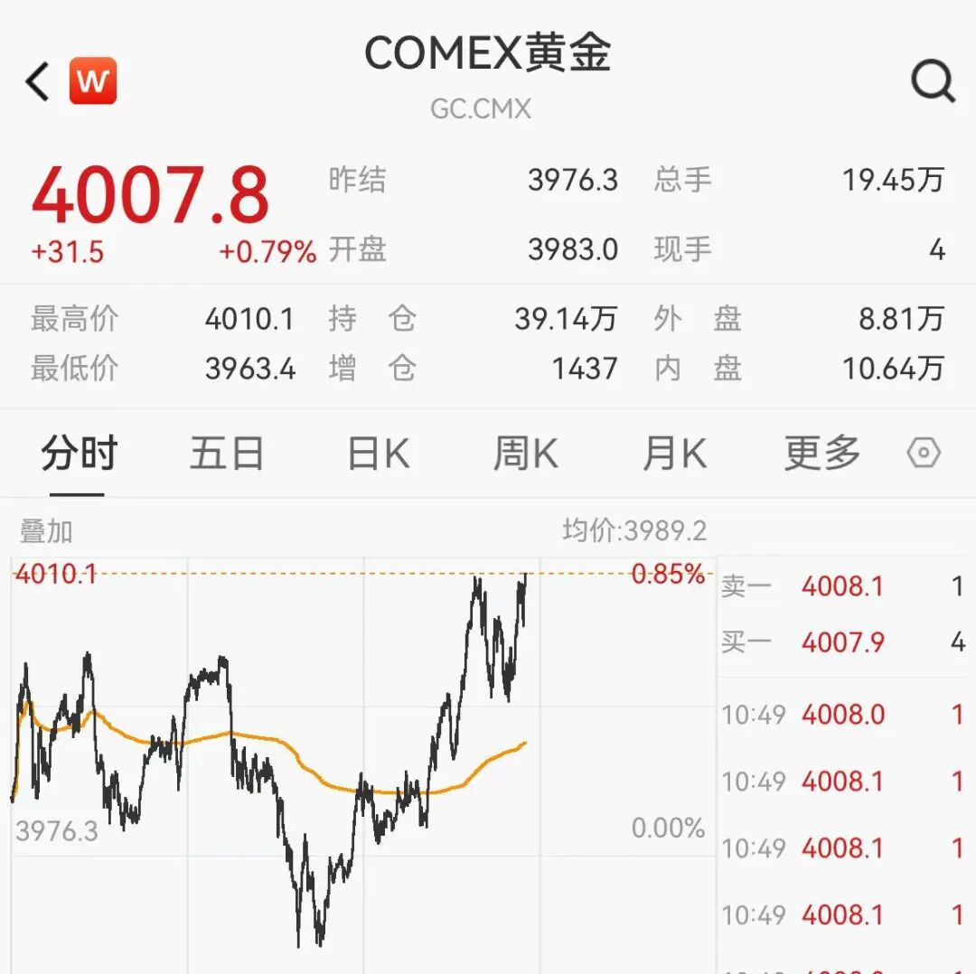 黄金延续涨势。7日晚间,现货黄金首次触及3990美元/盎司,创历史新高。COMEX黄金期货首次突破4000美元/盎司。