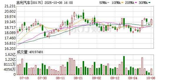 截至10月6日收盘,吉利汽车股价报19.03港元/股,总市值为1926亿港元。
