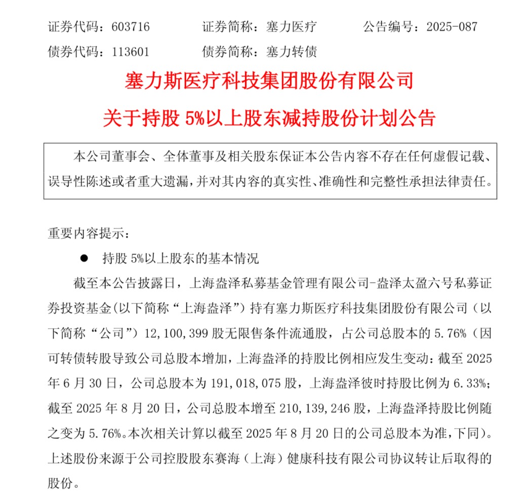 9月30日,塞力医疗(603716)发布公告,持股5%以上股东上海盎泽计划在2025年10月30日至2026年1月29日,通过集中竞价和大宗交易方式减持不超过420万股公司股份,占公司总股本的2%。