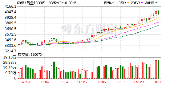 10月7日早些时候,COMEX黄金期货已经站上4000美元/盎司的新高位。截至7日收盘,COMEX黄金期货涨0.71%,报4004.80美元/盎司,日内交投区间为3963.40-4014.60美元。