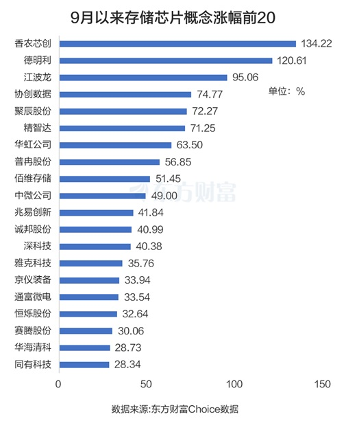 A股的存储芯片概念近期同样表现亮眼。东方财富Choice数据显示,9月以来香农芯创(代理/分销商)大涨134.22%,德明利(存储模组)大涨120.61%。江波龙(存储模组)、协创数据(存储模组)、聚辰股份(存储接口)、精智达(封装与测试)等也在9月以来明显上涨。整体而言,存储芯片66只概念股9月以来有52股上涨,板块上涨概率约79%,上涨中位数为11.88%。