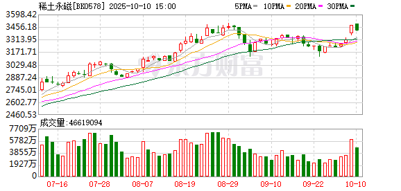 10月9日,稀土永磁板块报收3478.64点,涨幅为4.98%。10月10日,稀土永磁板块小幅回调。不过,安泰科技、钢研纳克等股票依旧保持较高的涨幅。