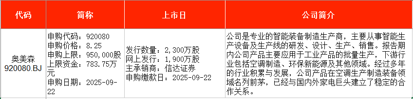 周五(10月10日)北交所将有1股上市,为格力电器、美的集团的供应商——奥美森智能装备股份有限公司(下称“奥美森”,920080)。