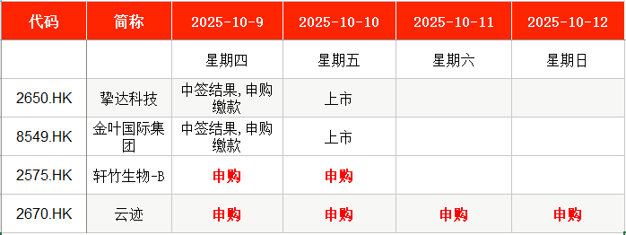Wind数据显示,本周(10月9日-10月12日)港股的轩竹生物-B(02575.HK)将在周四至本周五申购。云迹(02670.HK)则将于周四至周日申购。