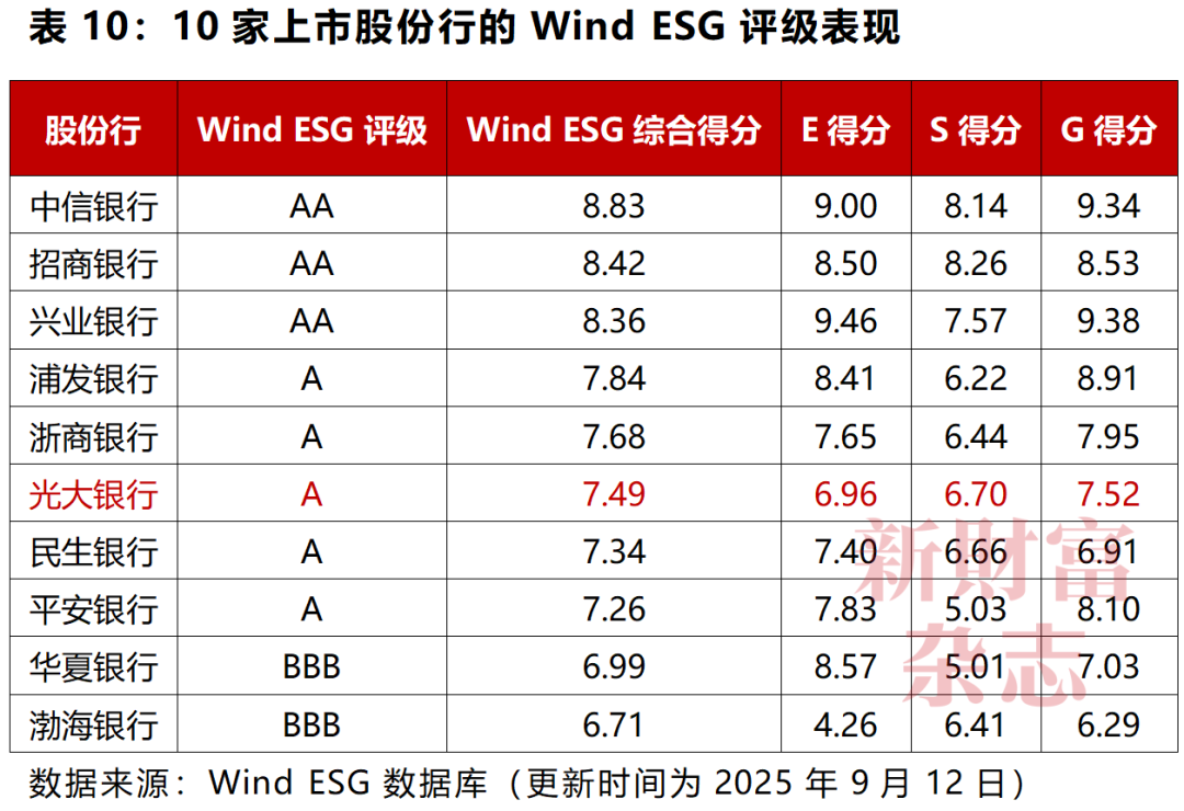 在Wind ESG评级中,光大银行综合评级为A,而中信银行、招商银行、兴业银行均为AA评级;其综合评分为7.49分,低于中信银行、招商银行、兴业银行、浦发银行、浙商银行(表10)。