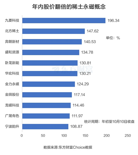 个股而言,东方财富Choice数据显示,在剔除年内上市新股后,九菱科技暂居稀土永磁板块“涨幅王”位置,年内涨幅196.34%。北方稀土紧随其后,年内上涨147.62%。奔朗新材排在第三,年内上涨140.53%。