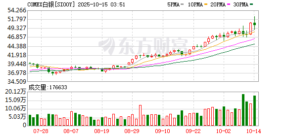 10月9日,现货白银价格涨4.4%报51.08美元/盎司,打破历史纪录。截至10月10日,伦敦现货白银报50.12美元/盎司,涨1.87%。