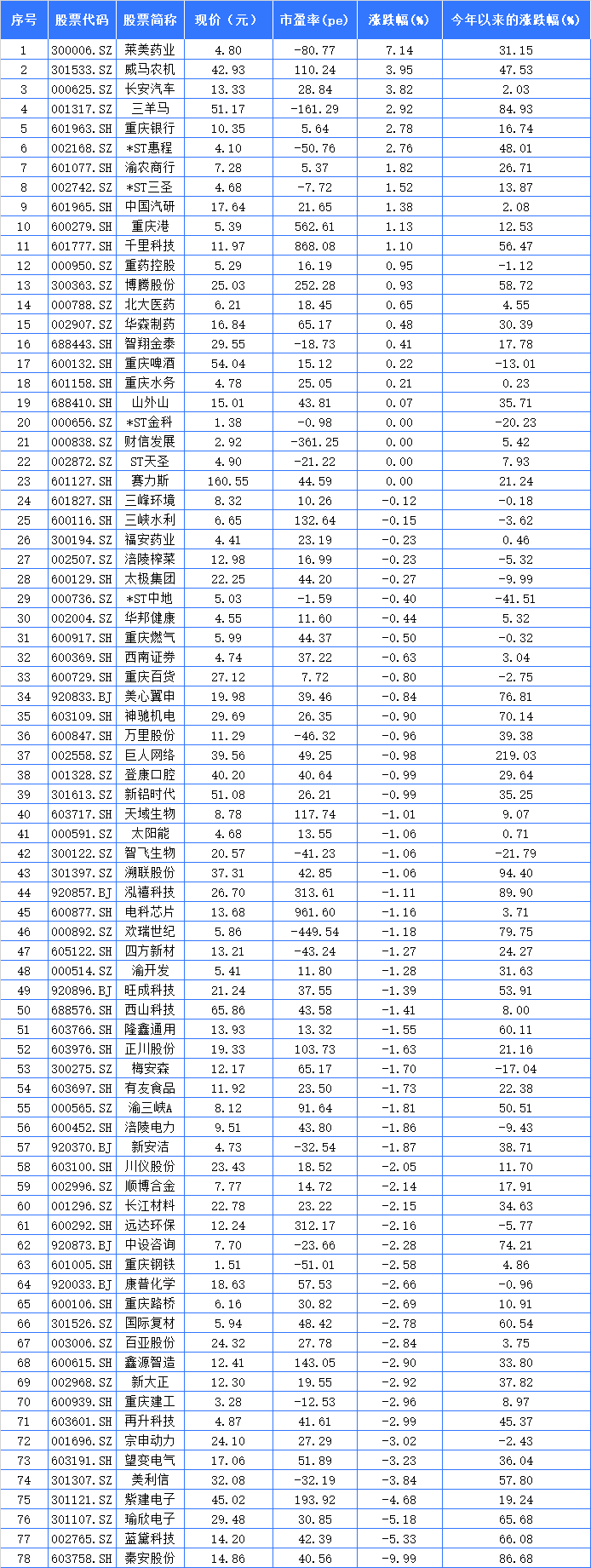 下跌渝股有55家,秦安股份、蓝黛科技和瑜欣电子分别以-9.99%、-5.33%和-5.18%,列涨幅最后三位。