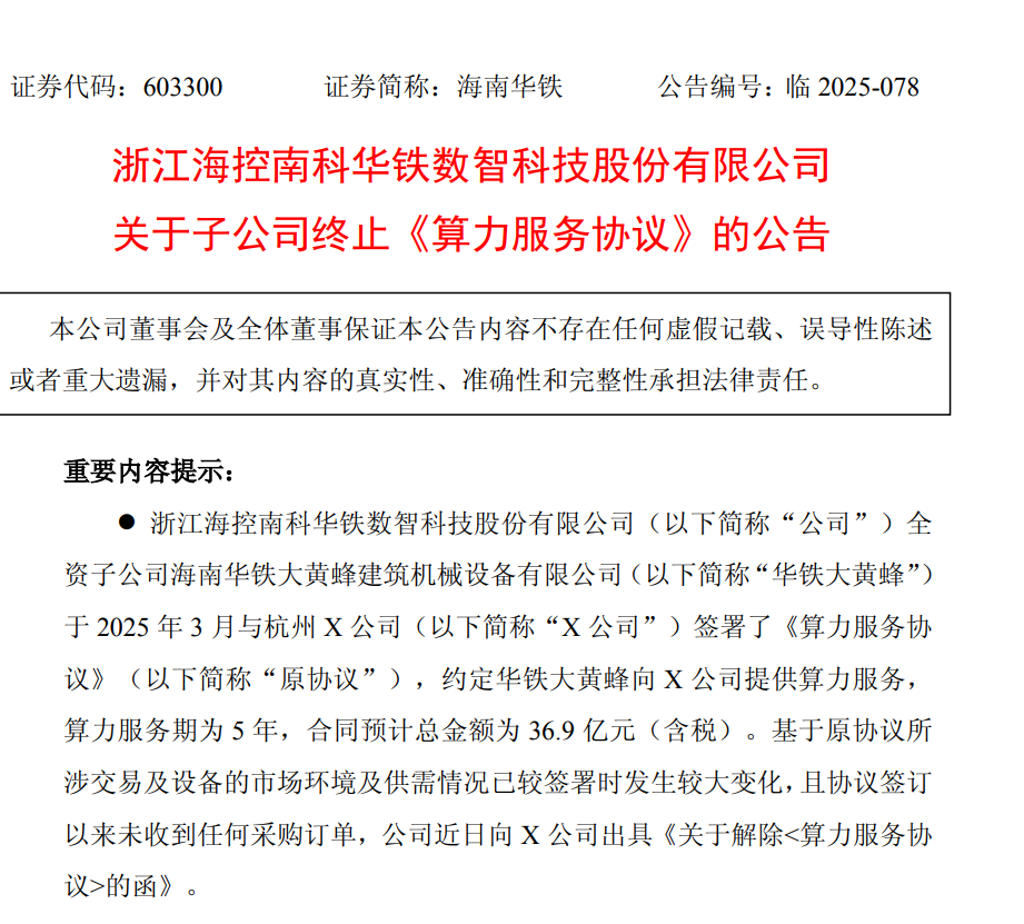 但半年多之后,9月30日晚,海南华铁公告,鉴于原协议所涉交易及设备的市场环境及供需情况已较签署时发生较大变化,且协议签订以来未收到任何采购订单,近日,华铁大黄蜂向X公司出具《关于解除〈算力服务协议〉的函》,后续X公司无需向华铁大黄蜂支付原协议所载价款,华铁大黄蜂亦无需向X公司提供原协议所载算力服务。