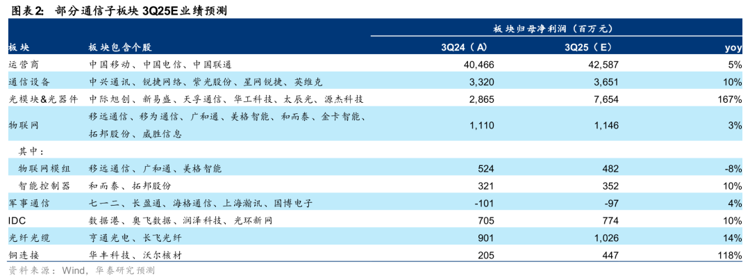 以38家我们覆盖的A/H通信行业公司为样本,我们预计3Q25通信板块合计归母净利润同比增长15%,剔除三大运营商、中兴通讯权重股后,预计板块归母净利润同比增长73%。细分来看,电信运营商利润预计稳健增长;光通信板块在海外与国内市场需求延续高增下,业绩有望持续兑现,且产业链景气度预计继续呈扩散趋势;IDC受益国内外智算中心需求增长有望迎来拐点;铜连接板块业绩有望在产能释放下逐步兑现;光纤光缆景气度有望逐步复苏。