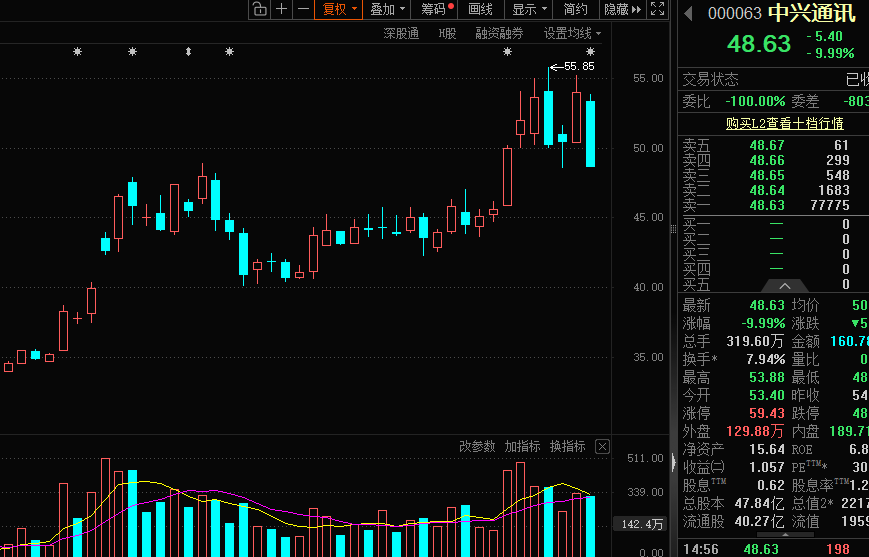 今日,中兴通讯(000063)A股跌停,7.78万手封单;同时,中兴通讯港股大跌12.83%。