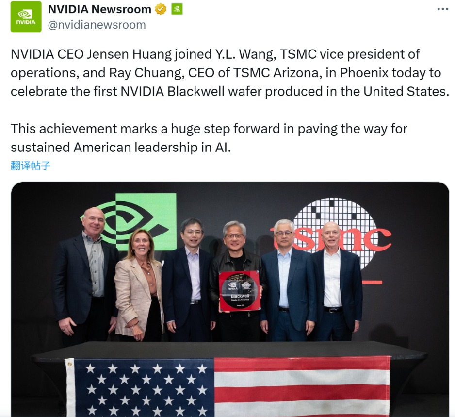 当地时间10月17日,黄仁勋到访台积电位于美国亚利桑那州凤凰城的半导体制造工厂,共同庆贺首片在美国本土生产的Blackwell晶圆正式下线。在庆典现场,黄仁勋与台积电运营副总裁王永利共同在这片晶圆上签名,意味着英伟达最新一代AI核心芯片正式在美国本土进入量产阶段。
