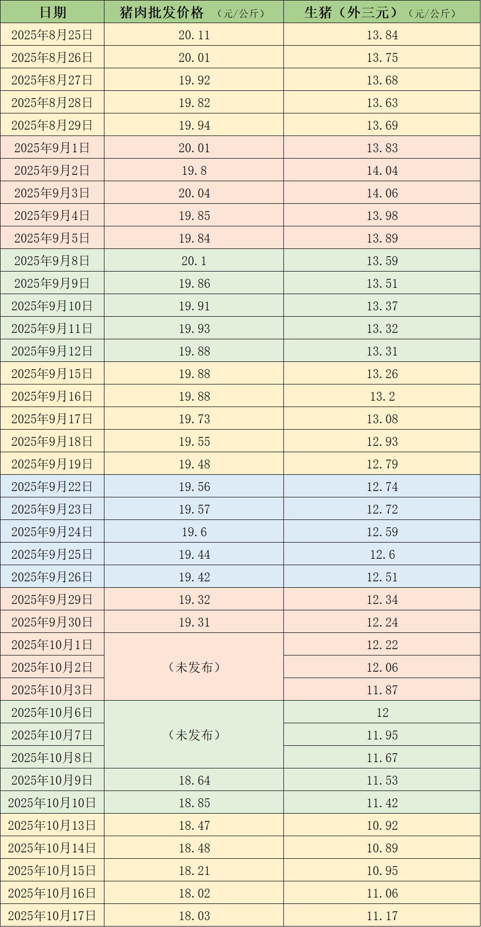 据农业农村部监测,10月17日,全国农产品批发市场猪肉平均价格为18.03元/公斤,与上周五(10月10日)的18.85元/公斤相比,下降4.4%。本周的平均价格为18.24元/公斤,与上周18.75元/公斤的均价相比,下降2.7%;与节前一周(9月22日-9月26日)19.52元/公斤的均价相比,下降6.6%。