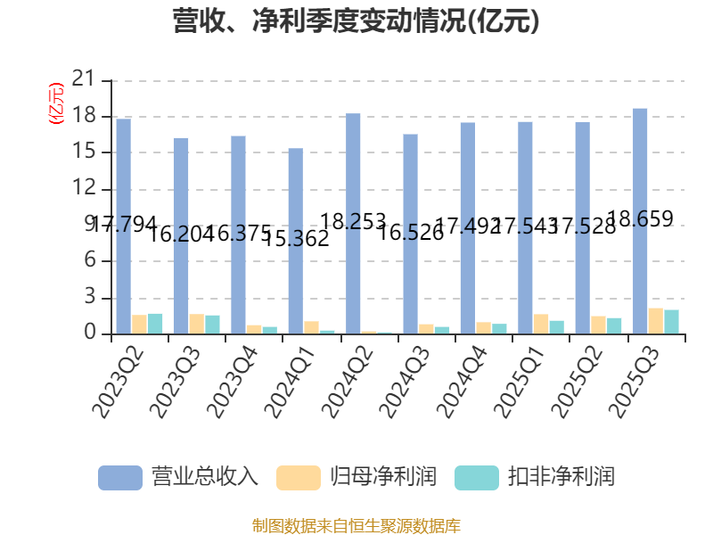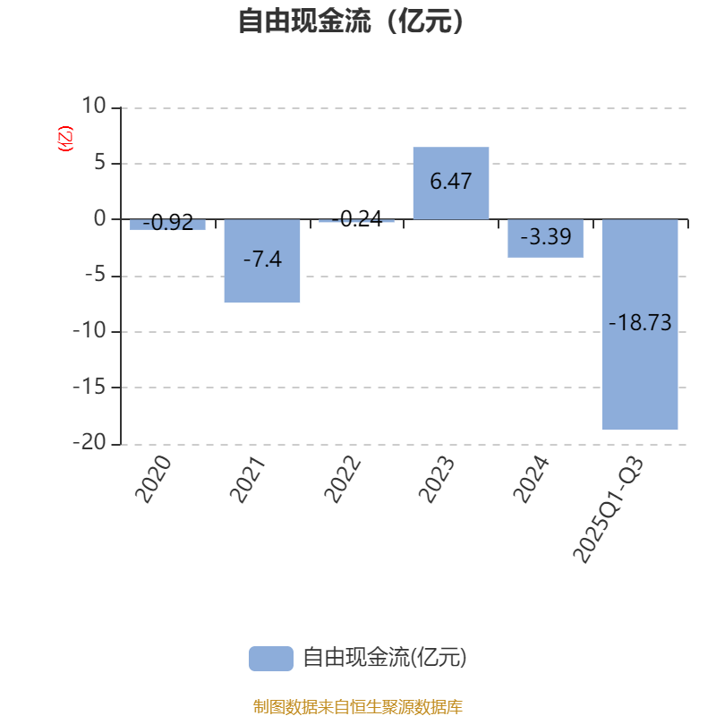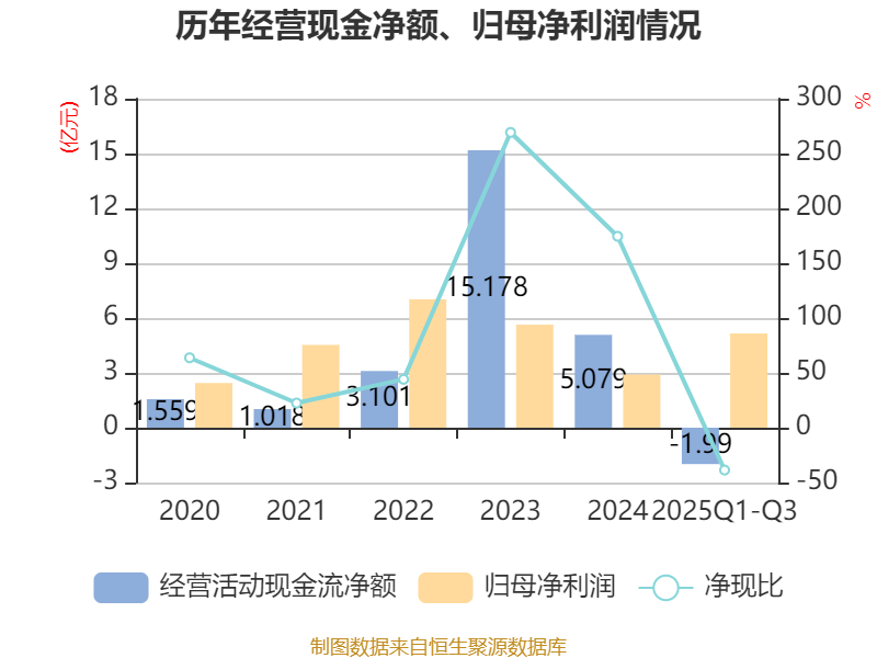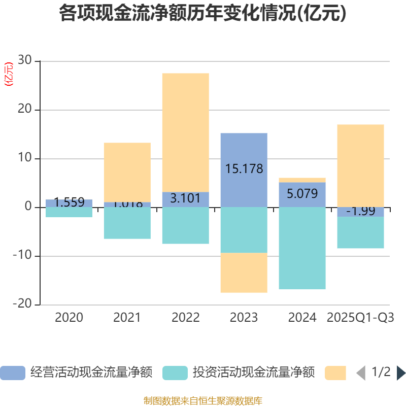 2025年前三季度,公司经营活动现金流净额为-1.99亿元,同比减少4.06亿元;筹资活动现金流净额16.94亿元,同比增加18.22亿元;投资活动现金流净额-6.48亿元,上年同期为-6.15亿元。