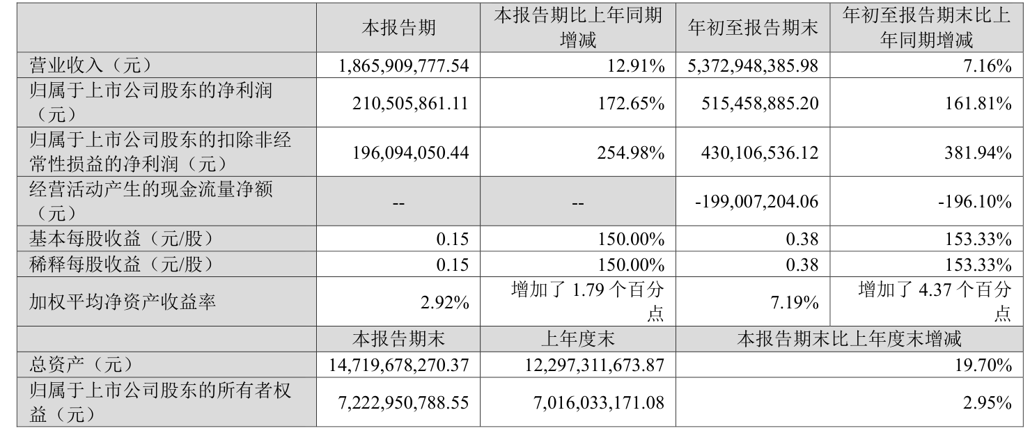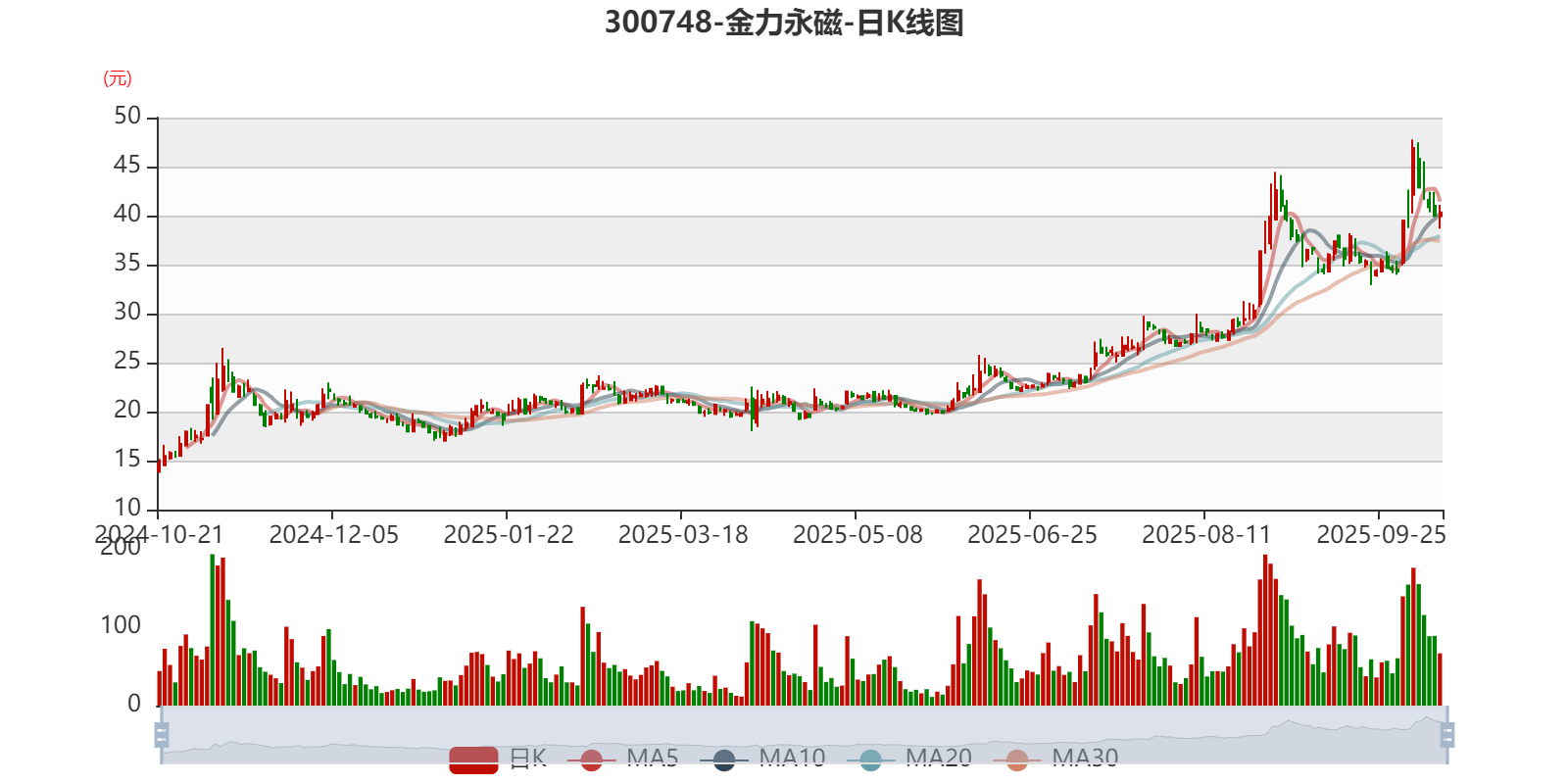 中证智能财讯金力永磁(300748)10月21日披露2025年第三季度报告。前三季度公司实现营业总收入53.73亿元,同比增长7.16%;归母净利润5.15亿元,同比增长161.81%;扣非净利润4.30亿元,同比增长381.94%;经营活动产生的现金流量净额为-1.99亿元,上年同期为2.07亿元;报告期内,金力永磁基本每股收益为0.38元,加权平均净资产收益率为7.19%。