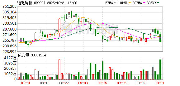 不过,虽然泡泡玛特业绩表现依然亮眼,但在二级市场却遭遇了一些挑战。尤其是在8月底创下339.80港元/股的新高后,近期股价持续调整,10月21日,泡泡玛特股价再次大跌8.08%,高点至今的跌幅已超过26%。